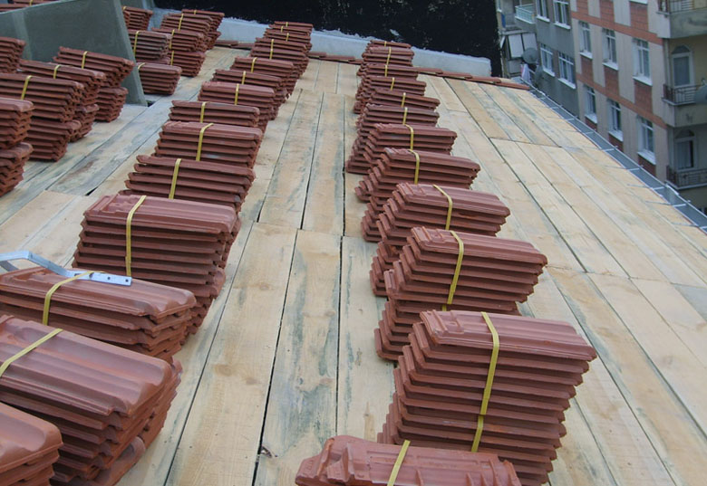 Çatı öncelikle ahşap malzeme ile tamamen kapatıldıktan sonra, üzerine kiremit malzeme uygun şekilde dizilerek çatı tamamlanır.